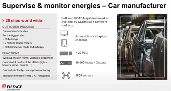 在汽车行业实施了一个重大项目,在世界前10大汽车制造商所在地的一个大型项目中实施了能源监督和控制、基础设施控制以及减少碳足印。
