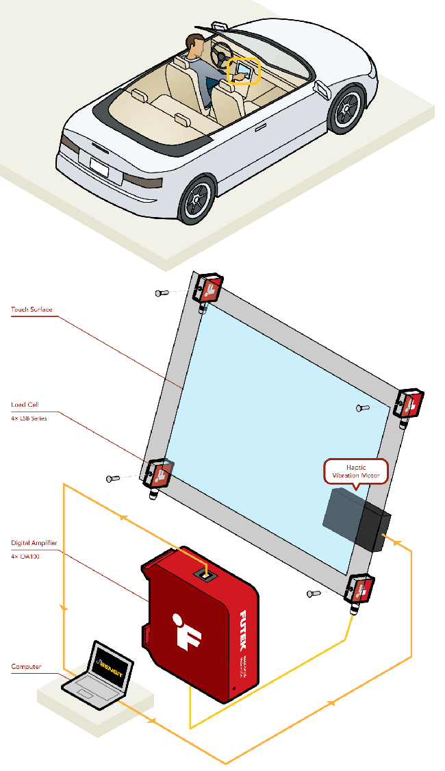 随着汽车娱乐的发展变得越来越复杂,在不直接看屏幕的情况下,控制他们的手变得更加困难,缺乏触觉反馈导致用户的大脑想要看屏幕来确认输入选择。通过安装测力传感器来测量接触力,机载计算机可以通过反馈不同大小的振动来确认输入的正确与否,确保驾驶员能正确输入。